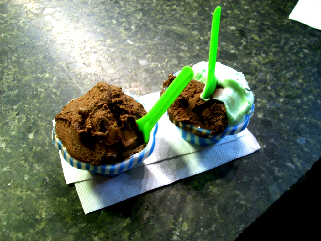 got gelato in Chelsea Market today with mom. Mine’s on the left. Chocolate-chili gelato…I’d suggest a cold refreshment to have with it, because it was indeed very spicy