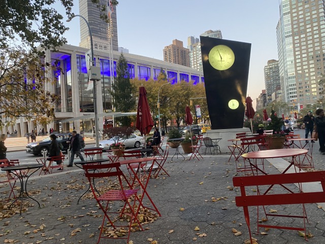 Excellent (if unseasonably warm) Thursday in early November. Ate pizza in Dante Park and decompressed in the changing breeze and changing light. Reflected on time while staring in the general direction of two clock faces.