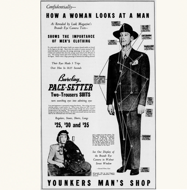“This amazing ad represents a perfect little punctum in the world of midcentury attentional surveillance, a moment in which the scientific advertisers advertised scientific advertising as…an advertisement. Which is to say, what we have here is an ad for menswear that deploys the datasets developed by an actual eye tracker that had been developed in order to measure the attention value of advertisements!”