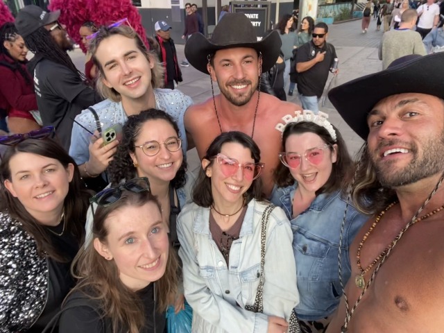 After a coffee break, we caught the Big Elvis show, then were accosted by some naked cowboys. We needed some group pics of ourselves anyway, so we were game to say hi.